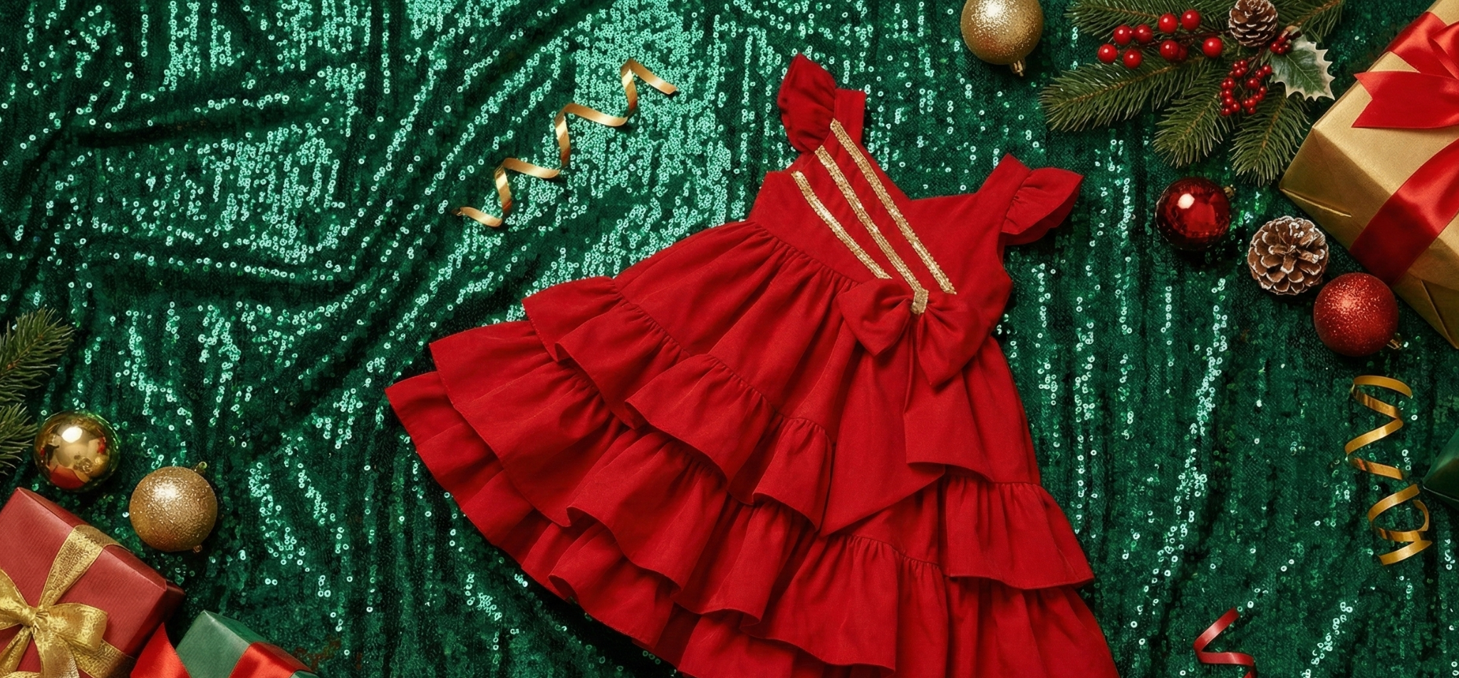 Agathe' Holiday Theme Red & Green Ruffle Vintage Kids Dress
